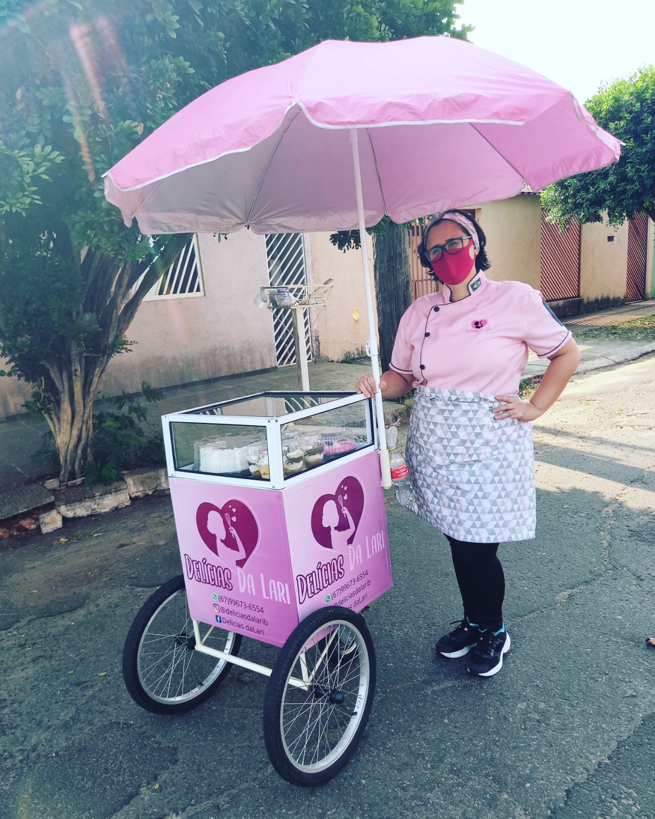 “Em 2018, eu e meu marido perdemos nossos empregos e ficamos no seguro enquanto procurávamos por outro. Usamos o último pagamento do seguro para comprar as coisas para fazer bolo no pote e tive a ideia de comprar um food kart, por causa da novela ‘Dona do Pedaço’. Peguei dinheiro emprestado e compramos nosso food kart personalizado”, conta a empreendedora.