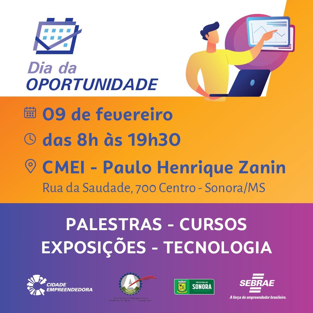 Com uma ampla programação para voltada para empreendedores locais, pequenos produtores e população em geral, o Dia da Oportunidade será realizado em Sonora no dia 9 de fevereiro. O evento gratuito é mais uma ação do programa Cidade Empreendedora no município, executado pelo Sebrae/MS em parceria com a Prefeitura Municipal.