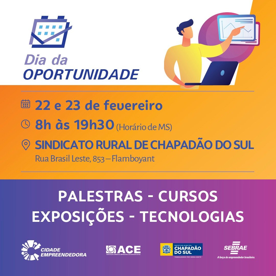 Com uma ampla programação, voltada para empresários locais, produtores rurais e para a população em geral, o Dia da Oportunidade será realizado em Chapadão do Sul nos dias 22 e 23 de fevereiro. O evento gratuito é uma iniciativa do Sebrae/MS, por meio do programa Cidade Empreendedora, em parceria com a Prefeitura Municipal.