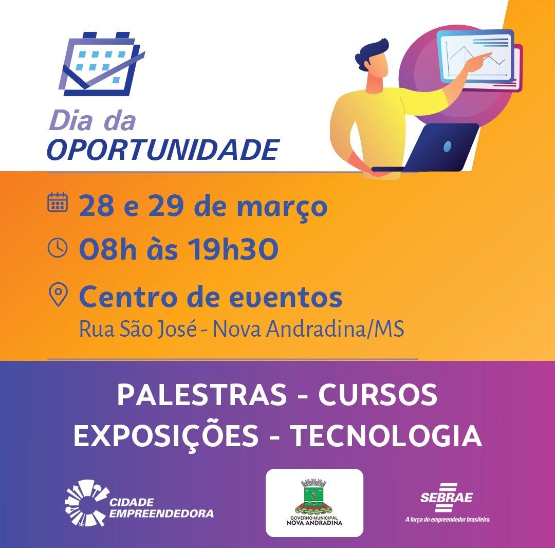 Com uma ampla programação, voltada para empresários locais, produtores rurais e para a população em geral, o Dia da Oportunidade será realizado em Nova Andradina nos dias 28 e 29 de março. O evento gratuito é uma iniciativa do Sebrae/MS, por meio do programa Cidade Empreendedora, em parceria com a Prefeitura Municipal.