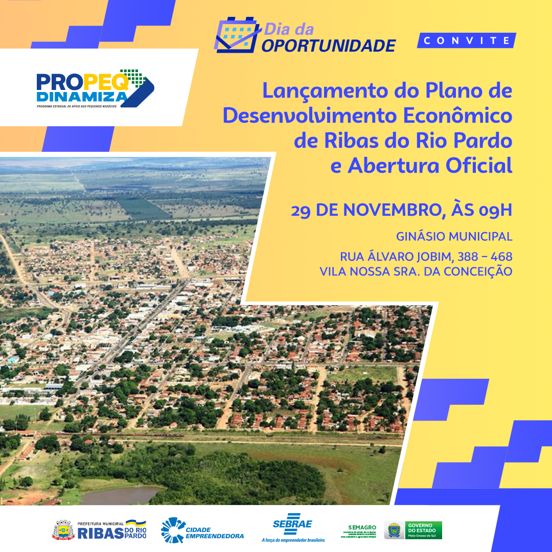 Na próxima semana, nos dias 29 e 30 de novembro, será realizado em Ribas do Rio Pardo, o Dia da Oportunidade. O evento é uma iniciativa do programa Cidade Empreendedora, executado pelo Sebrae/MS em parceria com a Prefeitura Municipal, e do Governo de Mato Grosso do Sul, através da Secretaria de Estado de Meio Ambiente, Desenvolvimento Econômico, Produção e Agricultura Familiar (Semagro) via PROPEQ Dinamiza.