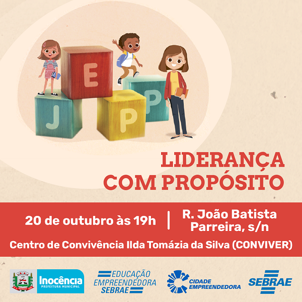 Por meio eixo de educação do programa Cidade Empreendedora, no dia 20 deste mês, o Sebrae/MS e a Prefeitura de Inocência, através da Secretaria Municipal de Educação, promovem a palestra “Liderança com propósito”, voltada para professores da Rede Municipal de Ensino que irão atuar na execução da metodologia Jovens Empreendedores Primeiros Passos (JEPP). Interessados em participar já podem se inscrever, basta clicar aqui.