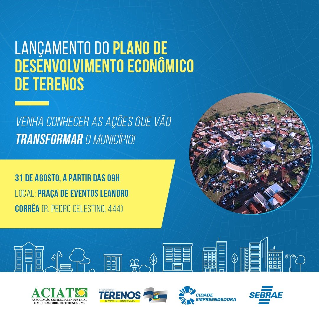 Em parceria com o Sebrae/MS, a Prefeitura de Terenos lança, nesta terça-feira (31), às 9h, o Plano de Desenvolvimento Econômico (PDE) para o município que inclui ações de melhorias voltadas para impulsionar o desenvolvimento da cidade. Com medidas de biossegurança, o evento será realizado na Praça de Eventos Leandro Corrêa, localizada na Rua Pedro Celestino, nº444.