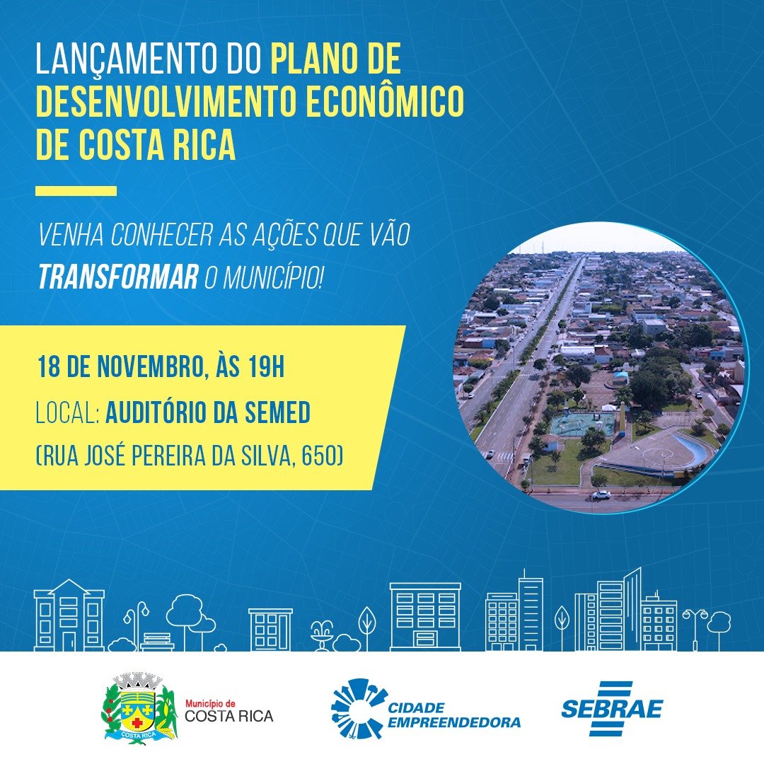 Em parceria com o Sebrae/MS, a Prefeitura Municipal de Costa Rica lança, nesta quinta-feira (18), o Plano de Desenvolvimento Econômico (PDE) para o município que inclui ações de melhorias voltadas para impulsionar o desenvolvimento da cidade. O evento será realizado, às 19h, no auditório da Secretaria Municipal de Educação (Semed). Segundo o prefeito de Costa Rica, Cleverson Alves, o plano irá auxiliar a gestão pública a agir de forma mais assertiva.