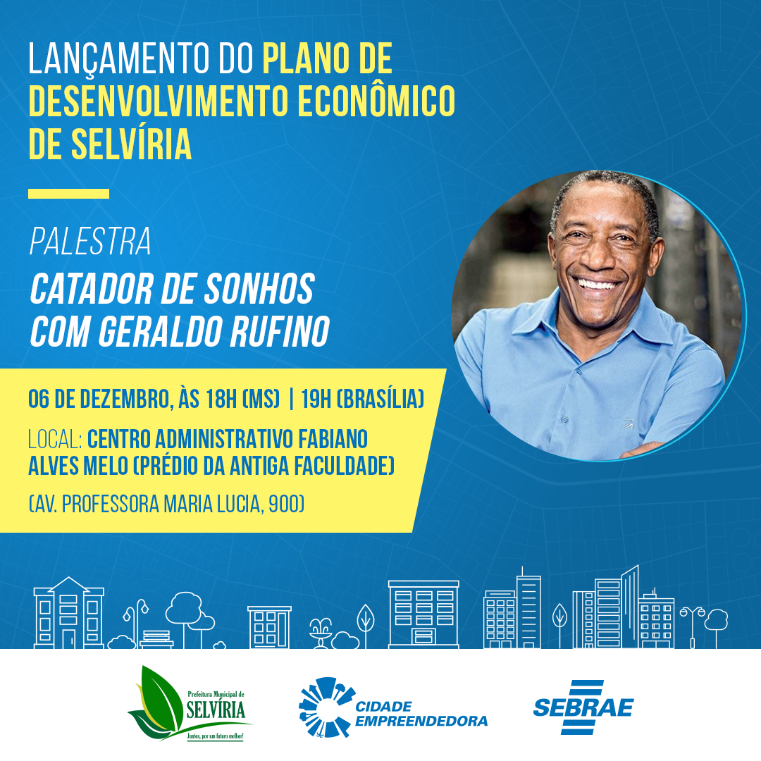 Após a apresentação do Plano de Desenvolvimento Econômico será a vez do empreendedor de sucesso, Geraldo Rufino, ministrar para o público a palestra “O catador de sonhos”. Geraldo já foi catador de latinhas e hoje é proprietário da maior empresa de reciclagem da América Latina, a JR Diesel. Na data, ele irá contar para os participantes a sua trajetória profissional, desde o seu primeiro trabalho, como carvoeiro, até o sucesso que atingiu como empresário.