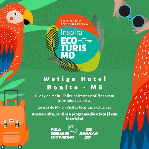 Entre os dias 18 e 21 de maio, Bonito (MS) receberá o Seminário Internacional Inspira Ecoturismo, uma iniciativa do Sebrae/MS, por meio do projeto Polo Sebrae de Ecoturismo. O encontro será realizado no Wetiga Hotel (Rua Cel. Pílad Rébua, 679), das 8h às 18h, com inscrições abertas pelo site. Como parte da programação, está prevista a realização de uma coletiva para a imprensa no dia 18, às 15h30, com as autoridades presentes.