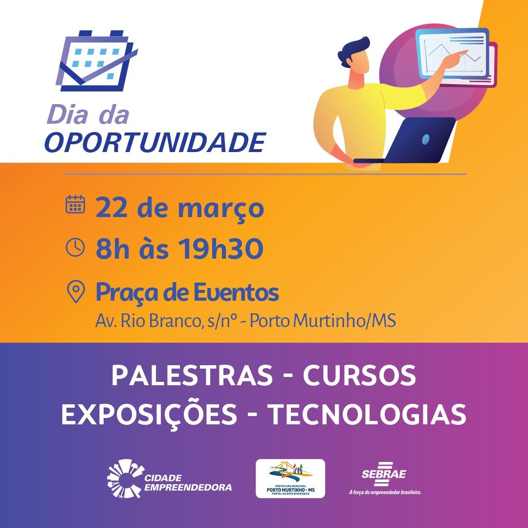 Voltado para empresários locais, produtores rurais e para a população em geral, no dia 22 de março, será realizado em Porto Murtinho, o Dia da Oportunidade. O evento gratuito é uma iniciativa do programa Cidade Empreendedora, executado pelo Sebrae/MS em parceria com a Prefeitura Municipal, e traz uma ampla programação para o público.