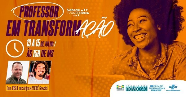 Mesmo com adaptações, as aulas no formato digital ainda são um desafio para muitos educadores. Visando apoiar os profissionais rumo à nova era de ensino, o Sebrae, em parceria com a União dos Dirigentes Municipais de Educação de Mato Grosso do Sul (Undime MS) e a Faculdade Novoeste, realiza entre os dias 13 e 15 de julho o evento “Professor em TransformAÇÃO”. As inscrições já estão abertas para os professores dos 79 municípios sul-mato-grossenses.